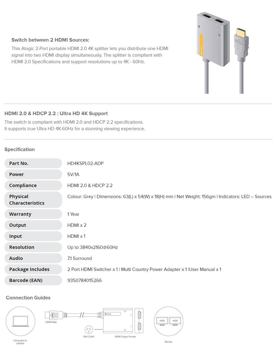 Alogic 2 Port Portable HDMI 2.0 4K Splitter with inbuilt 50cm HDMI Cable