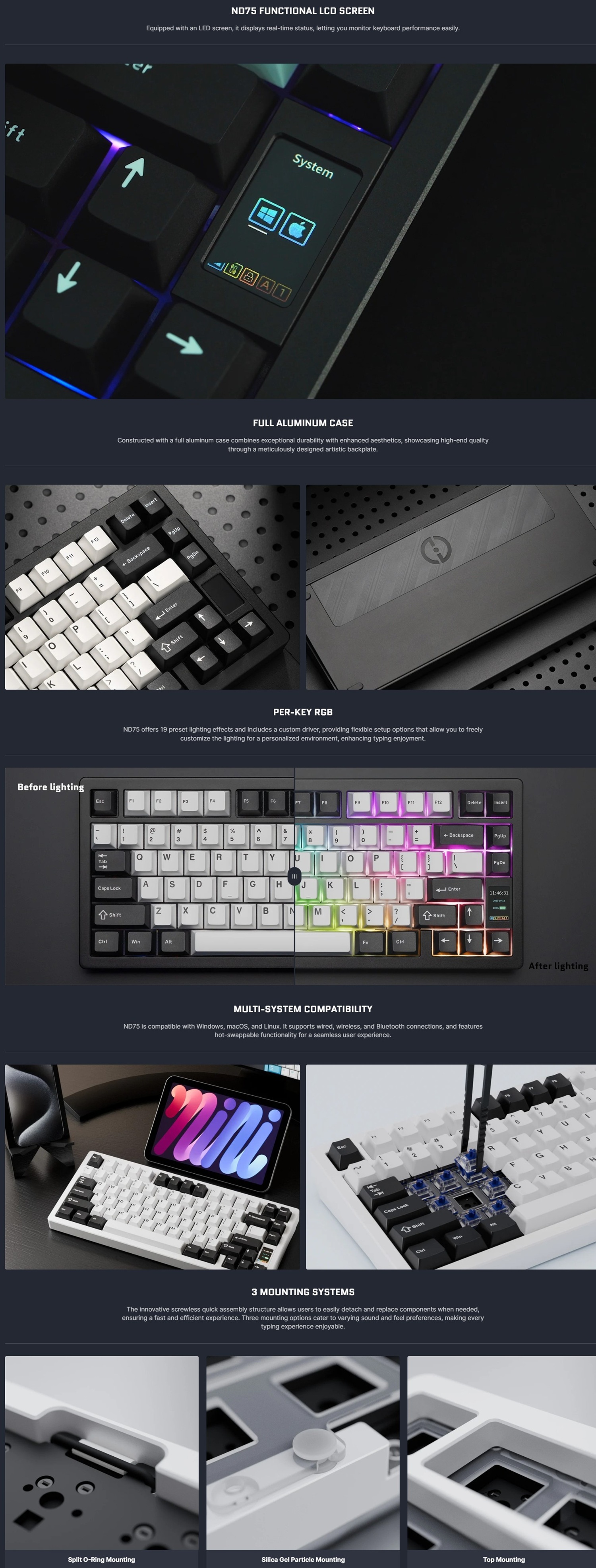 ND75 is a cost-effective keyboard featuring an aluminum case, equipped with an innovative LCD screen. It perfectly blends exceptional quality with innovative design, aiming to meet the diverse needs of users.