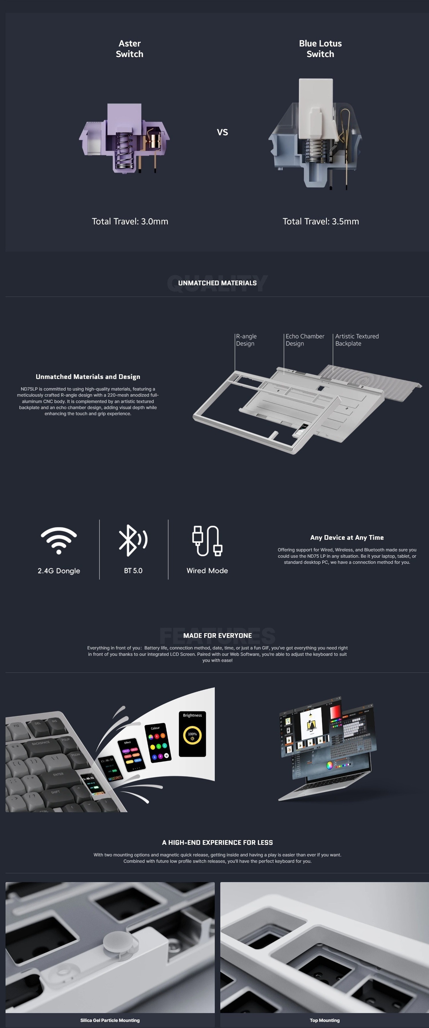 With over a decade of expertise from our dedicated product development team in the high-end keyboard market, the ND75 LP emerges as an affordable yet unmatched low-profile keyboard that perfectly blends comfort, quality, and innovative features.