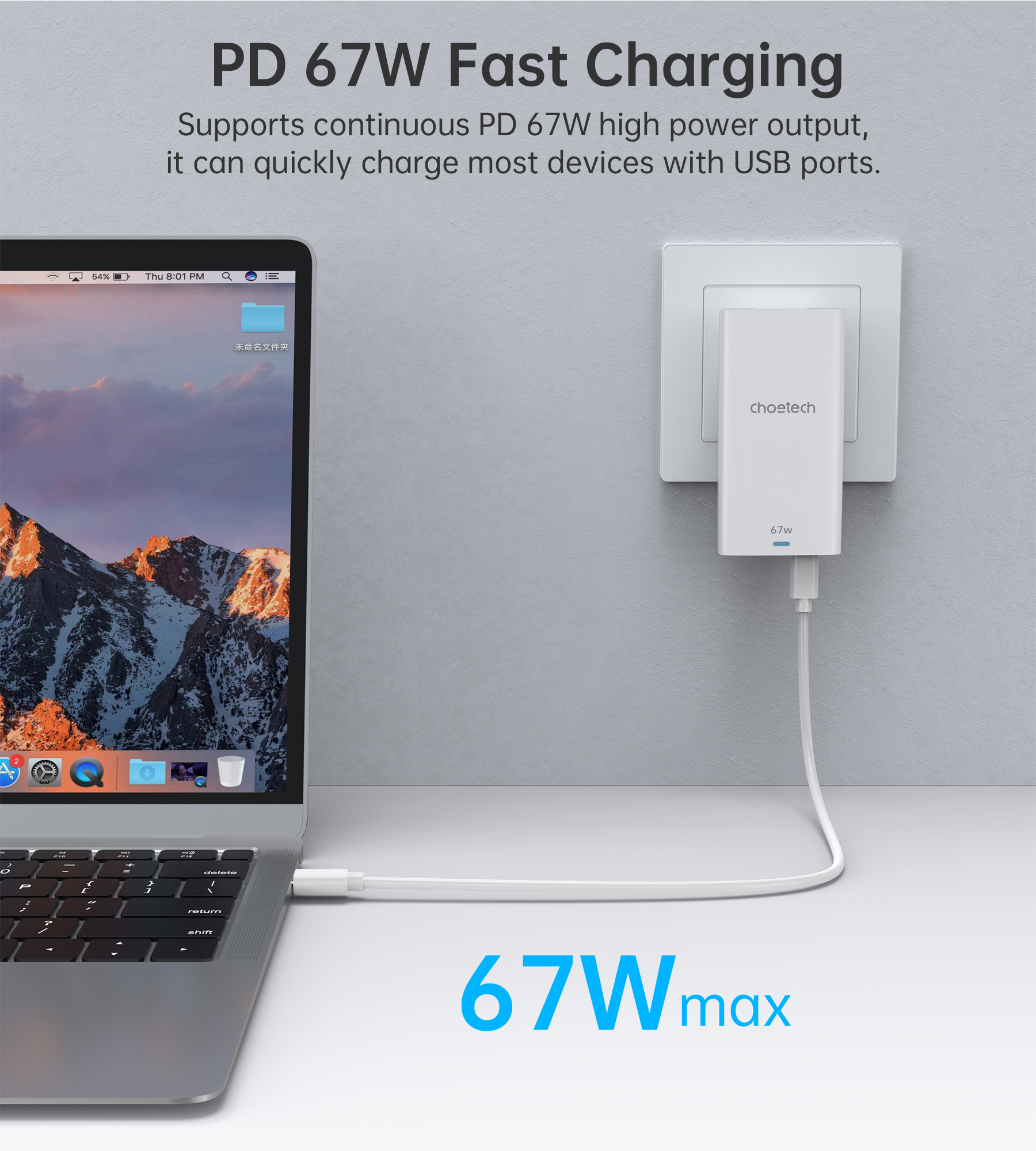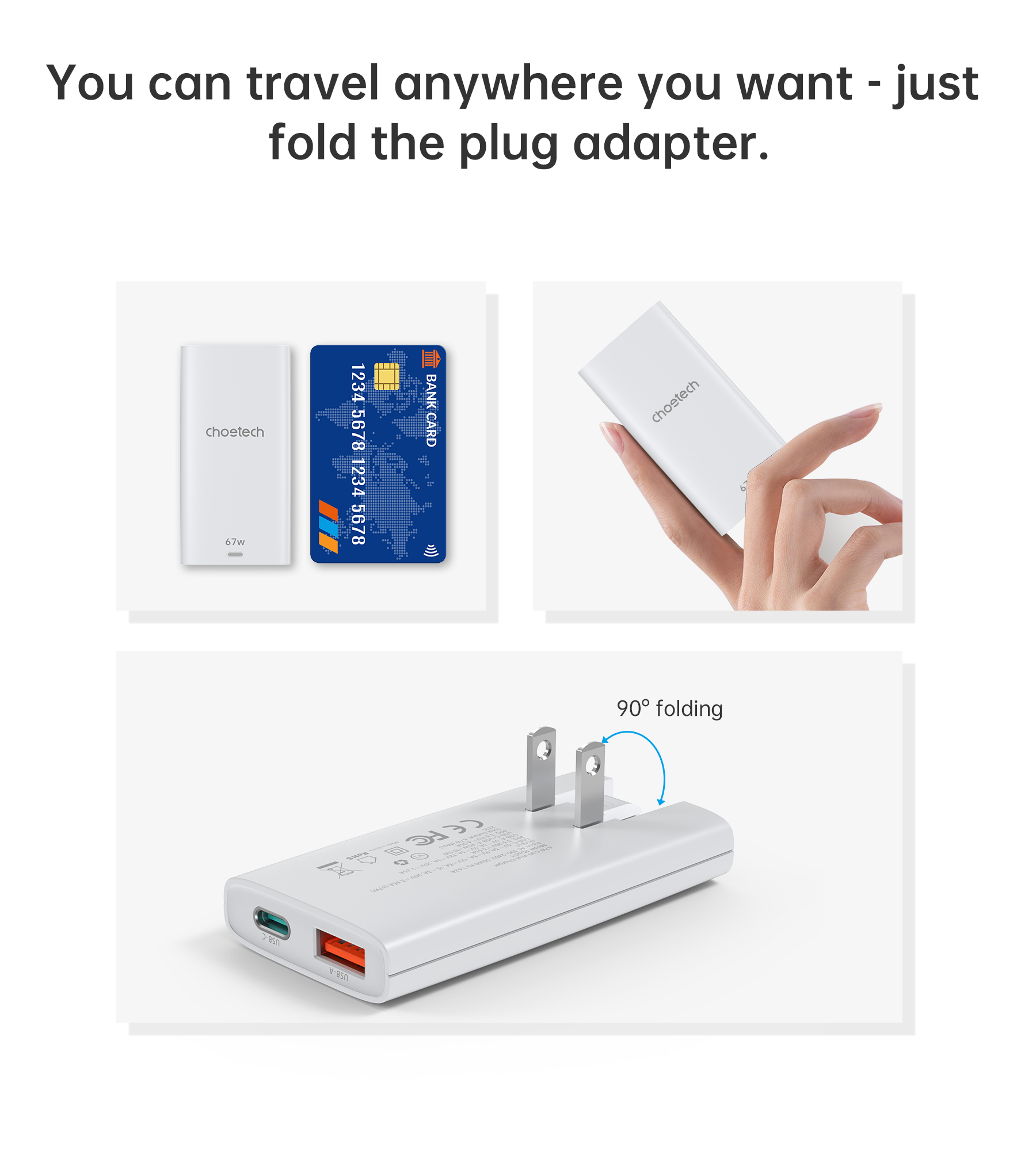 BEST OF BOTH WORLDS - Choetech PD6011 67W Travel Portable GaN Charger White USB-A + USB-C dual charging portsr