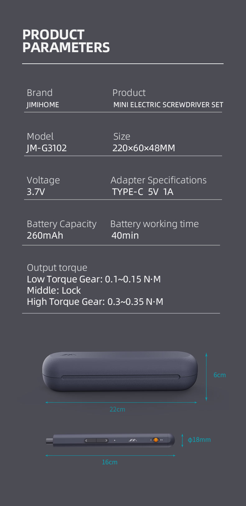 The Jimi Home device is created for multiple use scenarios. With the help of a special button, you can adjust the torque of the screwdriver. The highest gear (0.3~0.35 N⋅m) will be ideal for repairing larger electronics like laptops and game consoles. The lowest gear (0.1~0.15 N⋅m) will work well for more precise work like repairing eyeglasses, watches or phones. When you move the button to the middle - it will turn off the power and then switch to manual mode.