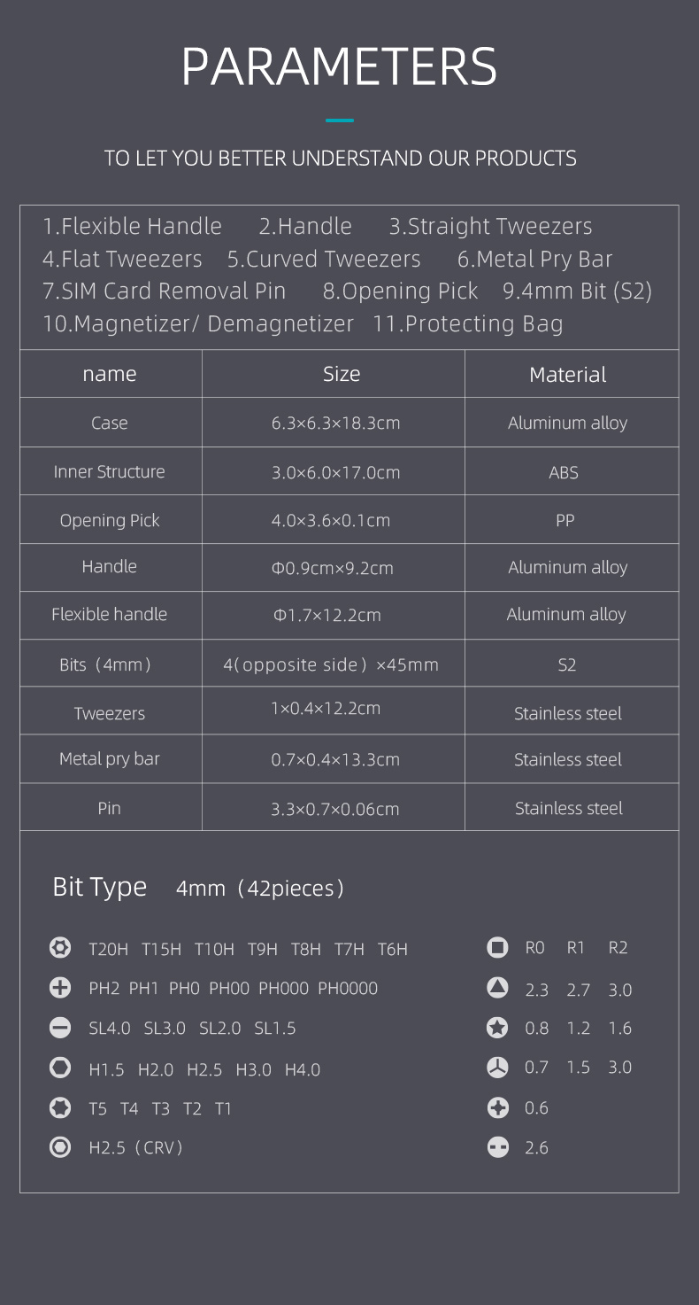 The JM-GNT56 set includes up to 42 different bits, 3 types of stainless steel tweezers, 2 handles, a SIM card extractor key, a metal undermount tool, a magnetizer and demagnetizer, and a sturdy case. The set of screwdrivers will be perfect, for example, when repairing a phone, maintaining models or other devices.