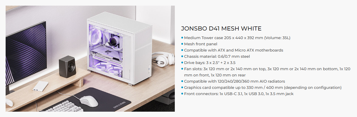 Jonsbo D41 MESH Tempered Glass ATX Mid Tower Case White D41 MESH White