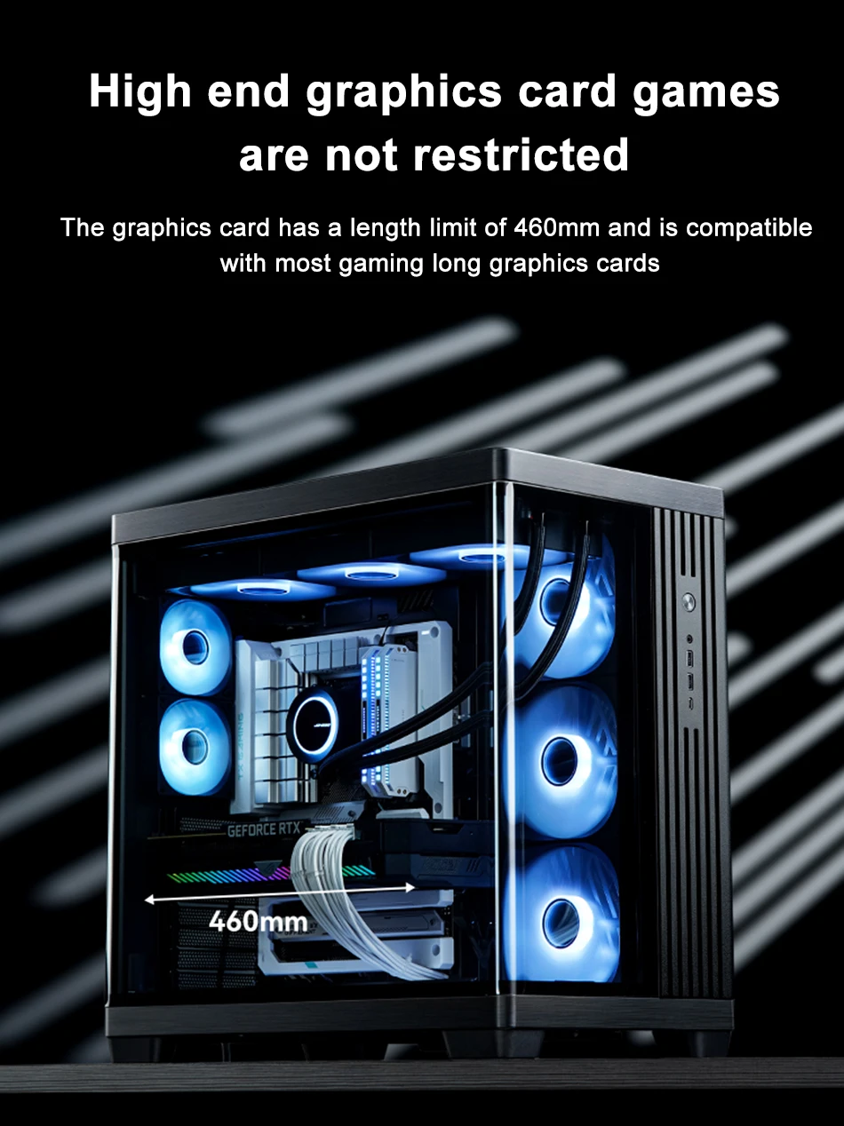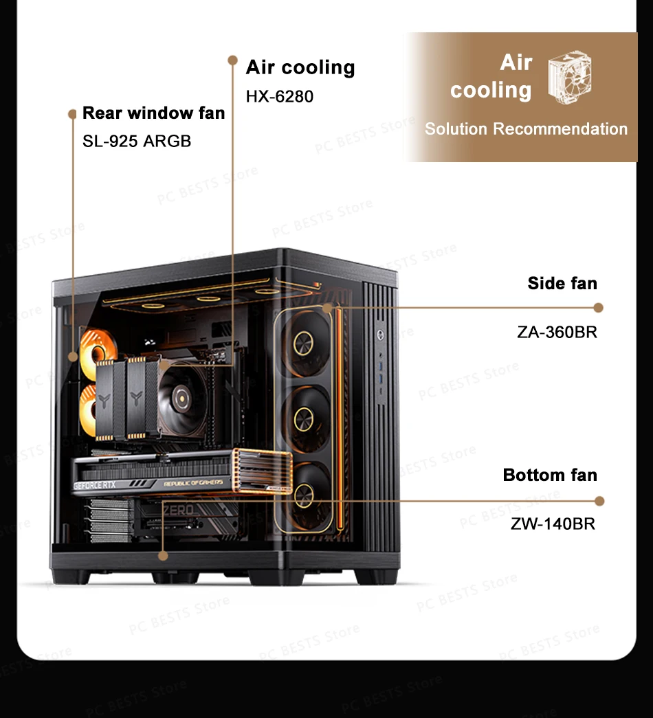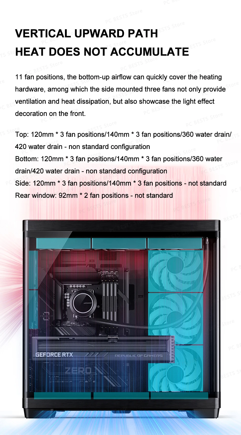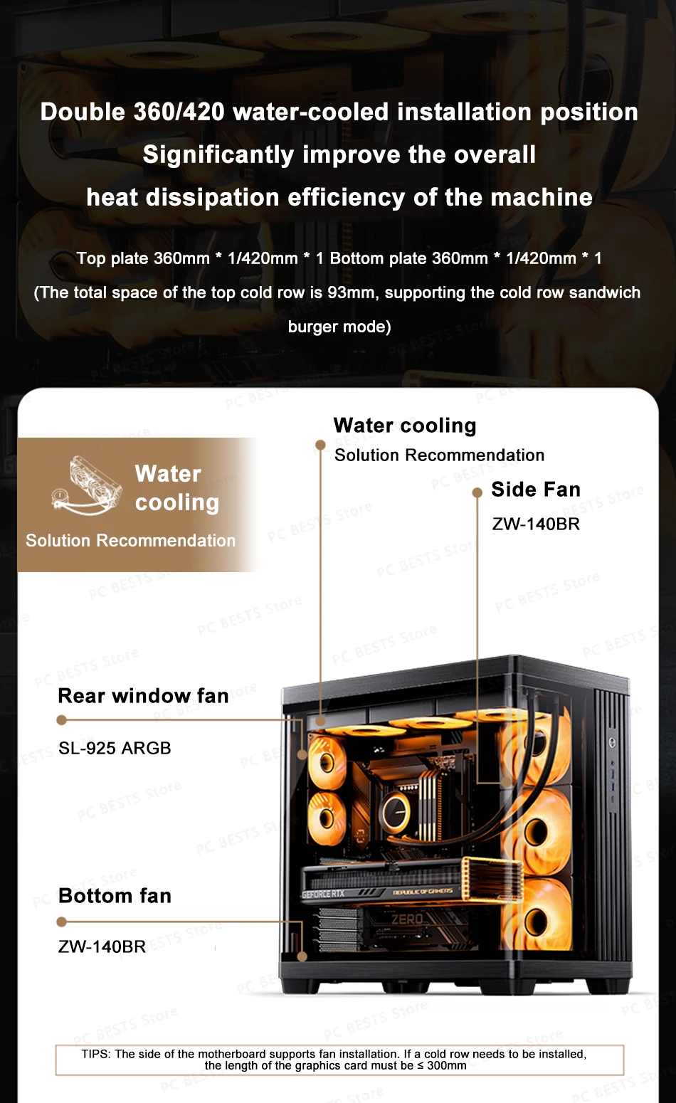 Fan: Top: 120mm * 3/140mm * 3 (not standard); Bottom: 120mm * 3/140mm * 3 (not standard) Right: 120mm * 3/140mm * 3 (not standard) Backboard: 92mm * 2 (not standard)