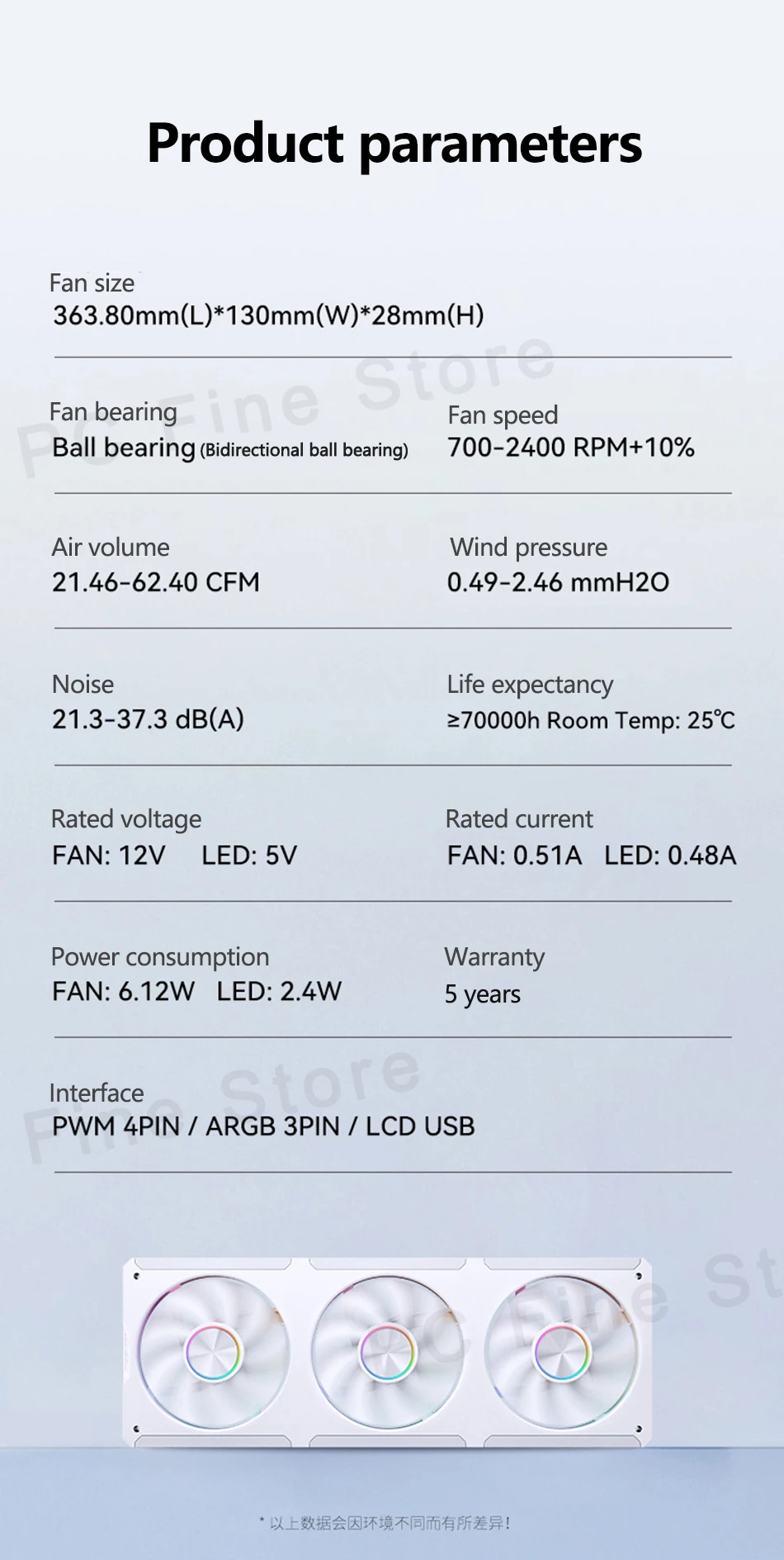 Fan size: 363.80mm (L) * 130mm (W) * 28mm (H)