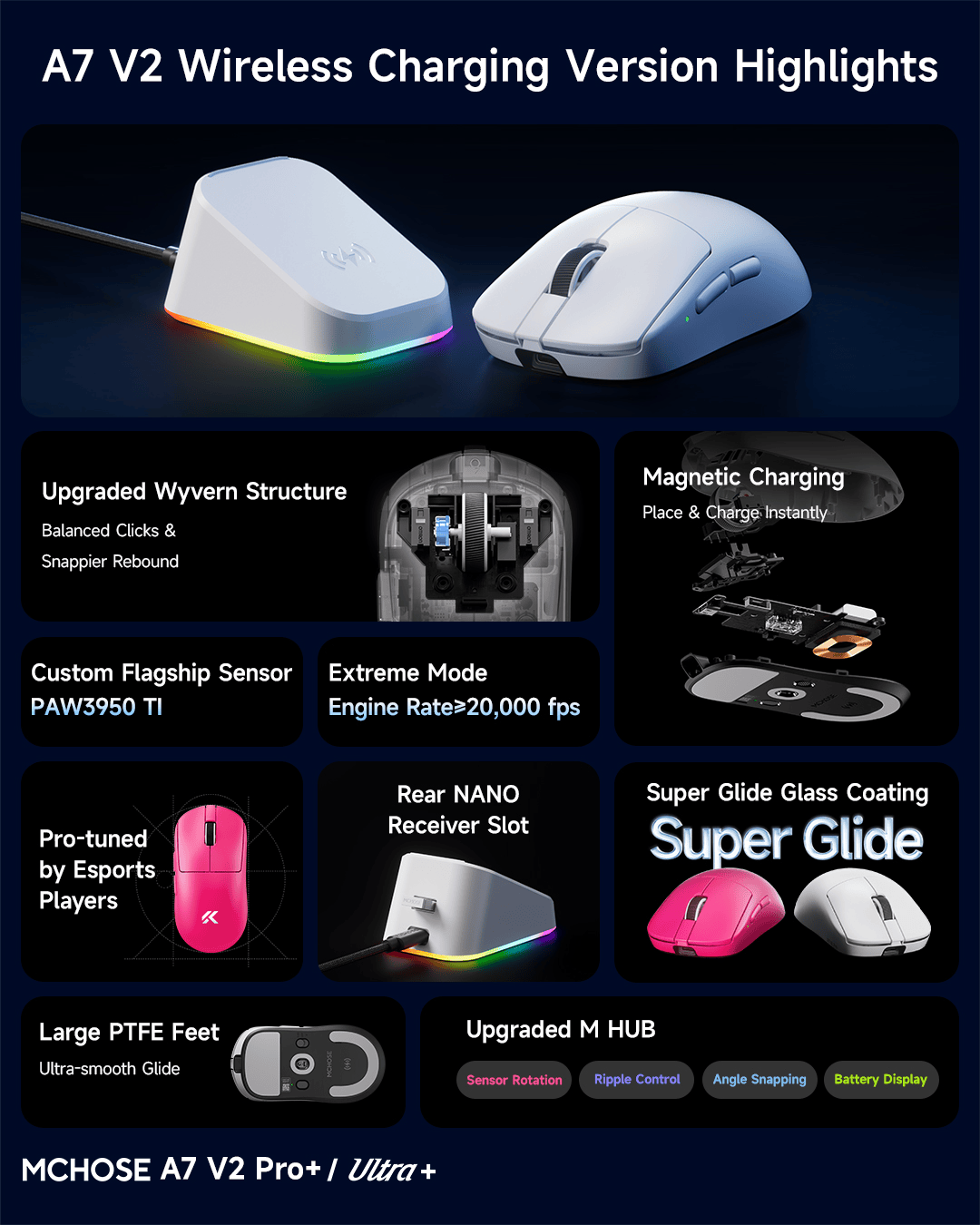 The A7 V2 Ultra/Ultra+ reaches 20,000 FPS and, with M-HUB driver, unlocks sensor rotate, waveform control, angle snapping, and battery display, plus customizable advanced functions for full performance control.