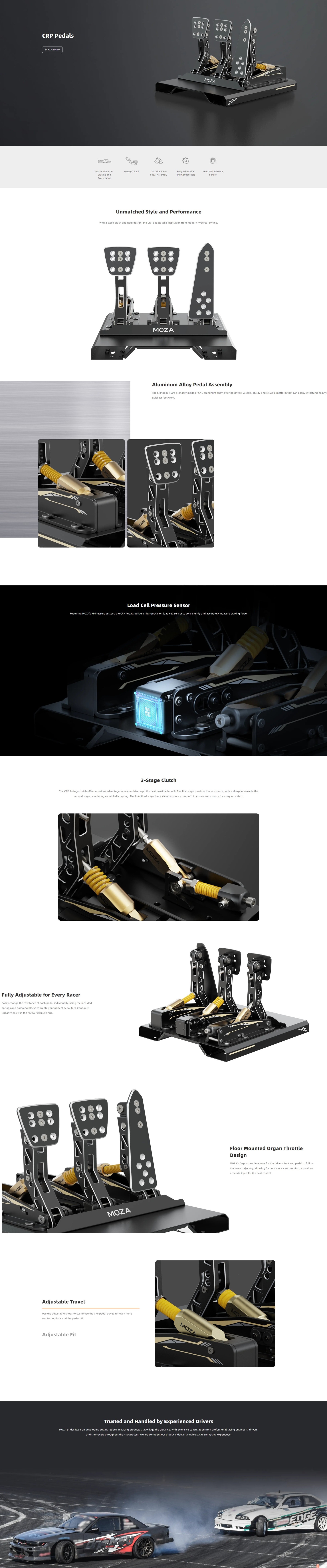 Master your speed like a pro with the MOZA CRP Pedals. Featuring a 3-stage clutch for superior control. The CNC aluminum pedal assembly ensures sturdiness and reliability. Adjust the angle to suit your preference and optimize your performance. With its high-precision pressure sensor, every input is accurately detected.