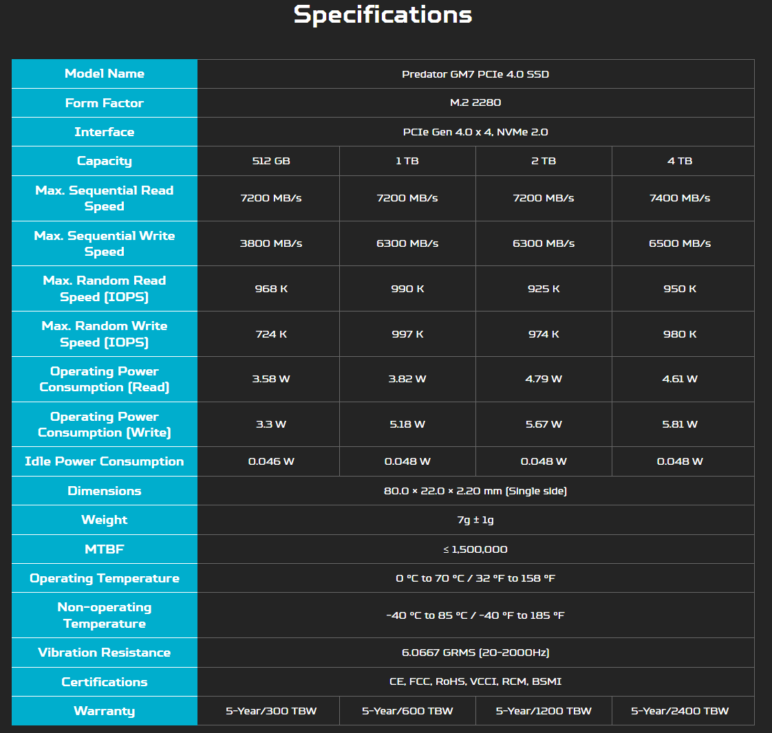 Predator GM7 1TB Nvme PCIe 4.0 M.2 SSD - 7400 MB/s Read, 6500 MB/s Write
