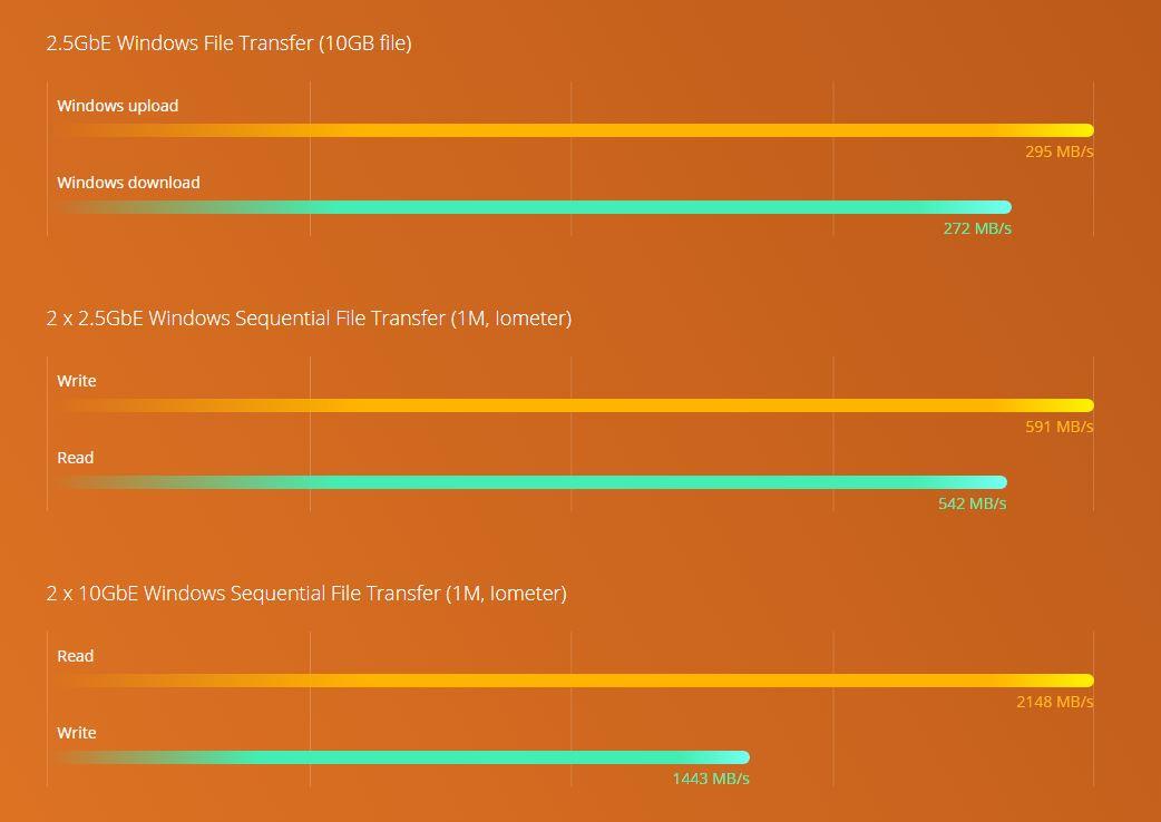 Both 2.5GbE ports are backwards compatible with 1GbE/ 100MbE/ 10MbE speeds. Up to 5 Gbps transfer speeds can be achieved by using port trunking.