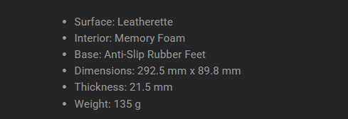 The Razer Ergonomic Wrist Rest’s soft memory foam cushion offers comfortable support for your wrists when you’re spending long hours on a keyboard, and is encased in smooth, plush leatherette that requires little maintenance.