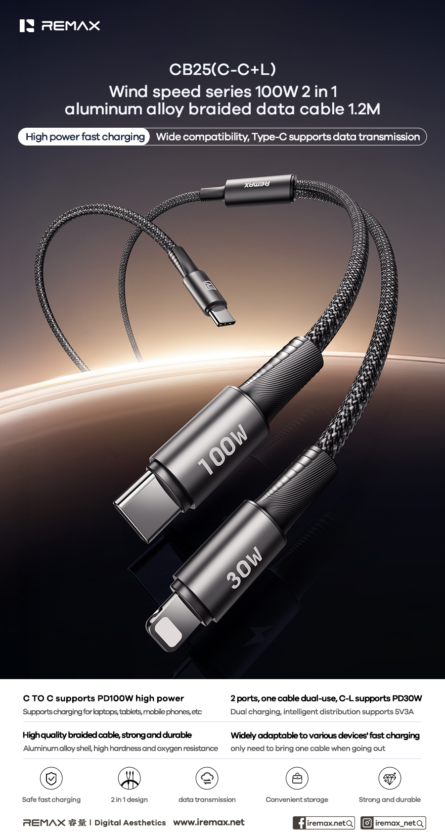 1. High quality braided cable, strong and durable, resistant to entanglement; Aluminum alloy shell, high hardness and oxygen resistance