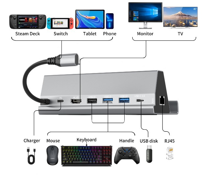- 【SGL Angled USB-C 7-In-1 4K Multiport Docking Station with Power Delivery For Steam Deck Base】 Equipped with an HDMI 2.0 4K@60HZ output, a PD 3.0 Fast Charging Port, a Gigabit Ethernet input, USB-C Power Delivery port and Triple USB-A 3.0 charging port, which supports fast charging for steam deck and most mobile devices.