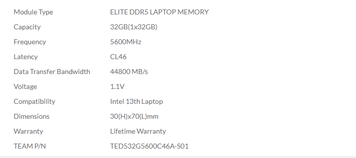 Team Elite 32GB DDR5 5600MHz CL46 SO-DIMM Laptop Memory TED532G5600C46A-S01
